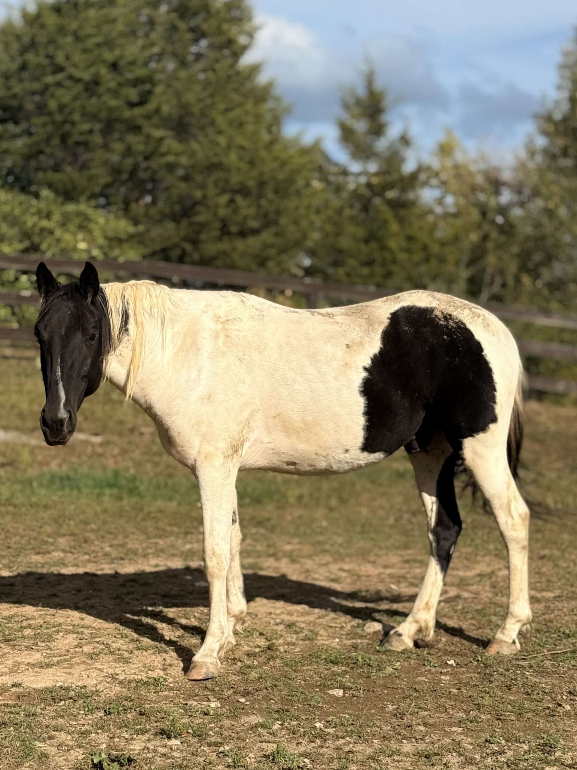 Bandit arrived at our sanctuary in 2023 as a young, completely feral gelding with very little positive human experience. In the beginning, even routine care was overwhelming for him. He needed sedation for farrier visits, but has recently been able to be trimmed without sedation.