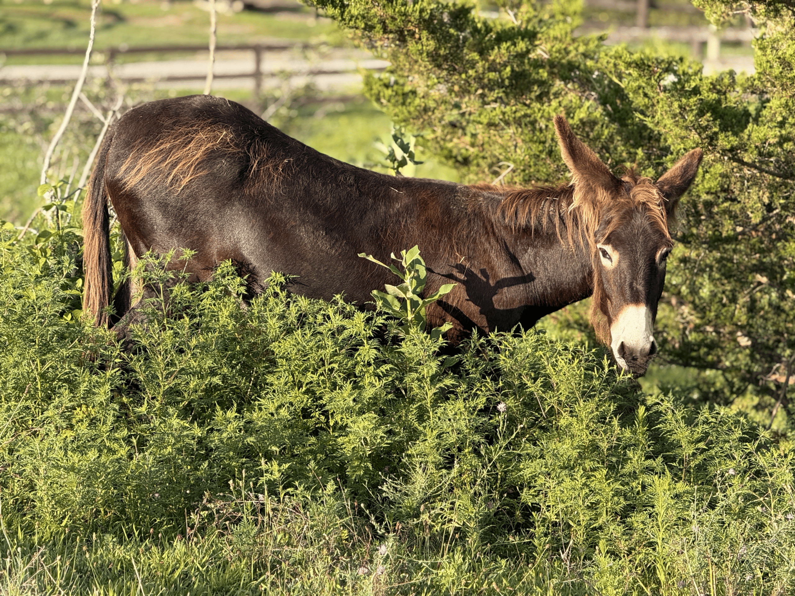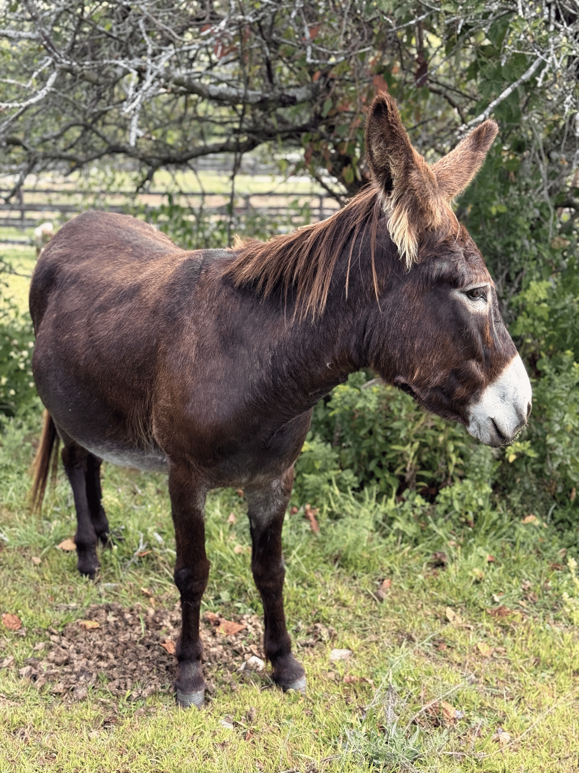 Jolie is believed to be a Poitou Donkey from the Poitou region of France. She is unique with her shaggy hair and large ears. Jolie is very sweet and a lot of fun to be around. She loves the company of her human handlers as well as her pasture mates, the miniature horses.