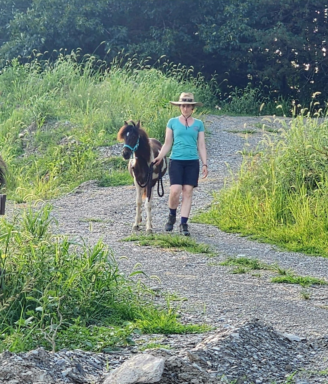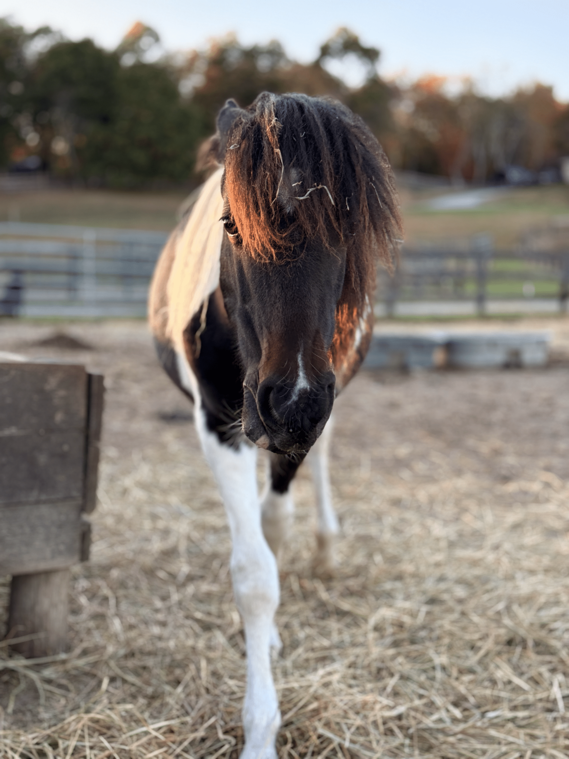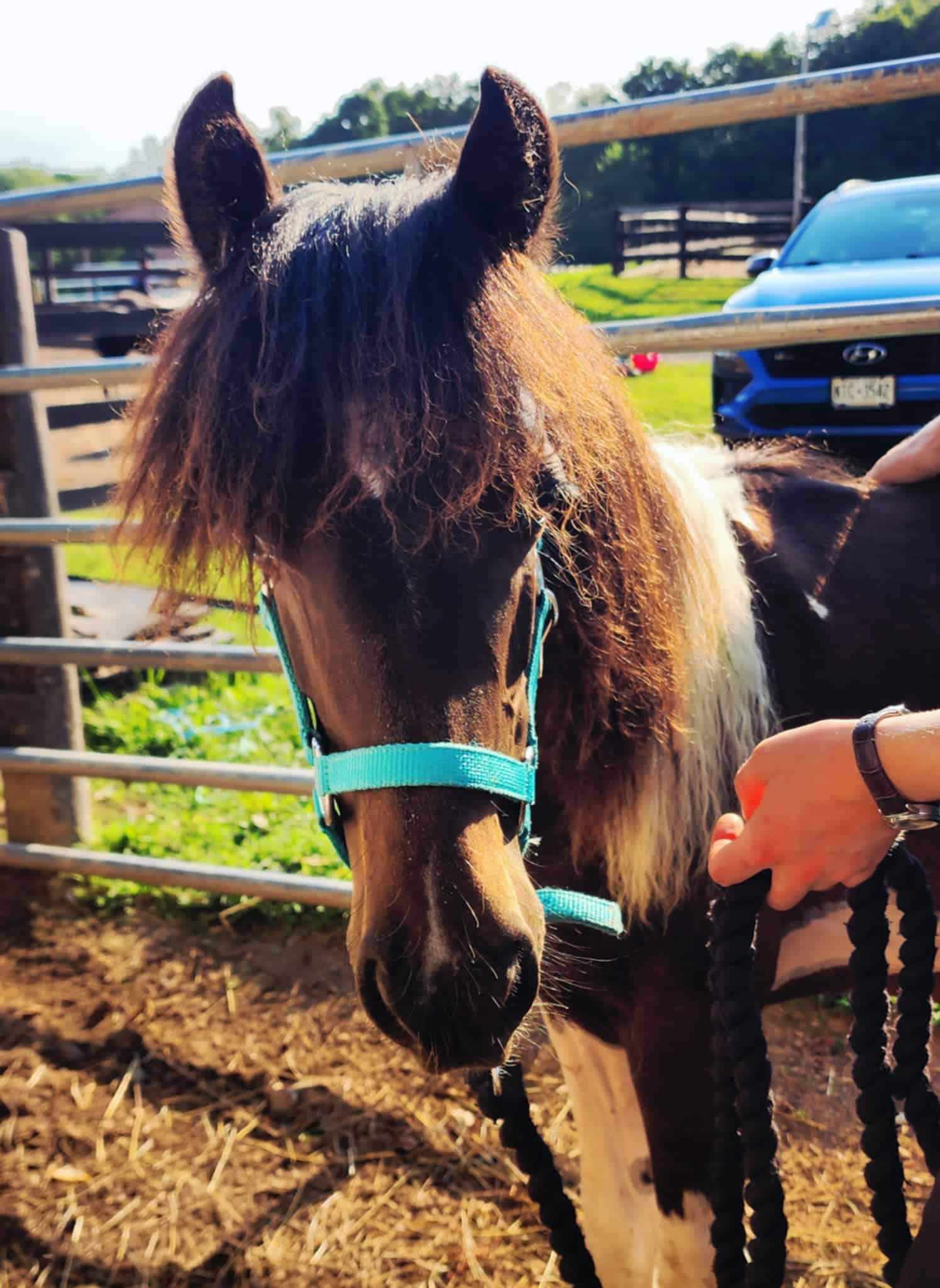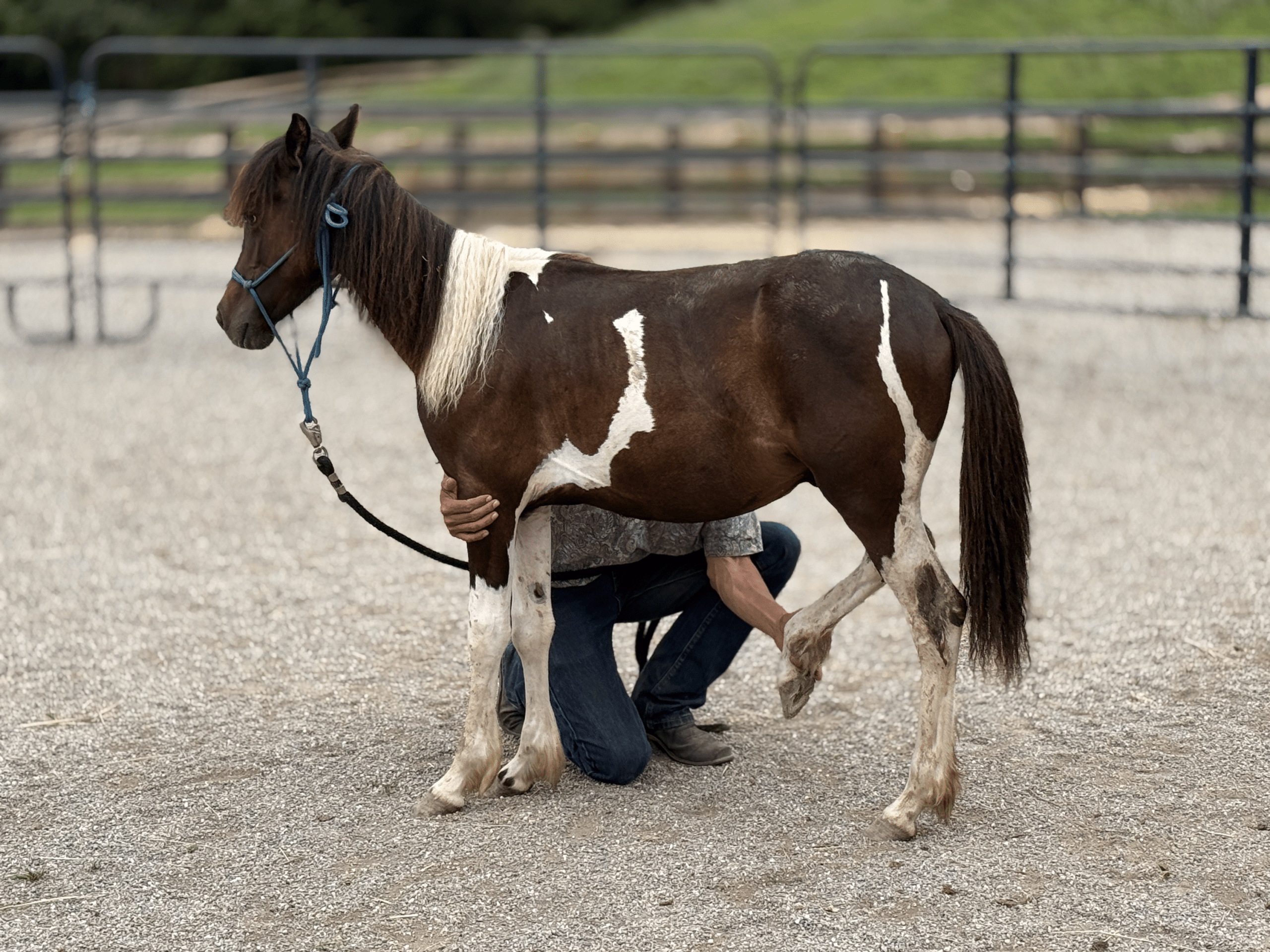 He cross‑ties politely and stands for trimming without sedation. Because he’s still learning to balance during hoof care, we’re giving him patient practice to help him grow stronger and more coordinated. At roughly two years old, Vinnie is still very much developing physically, so riding is at least a few years in the future. He also won’t mature into a size suitable for adult riders, but he has all the makings of a wonderful companion or future kid’s pony with continued training.