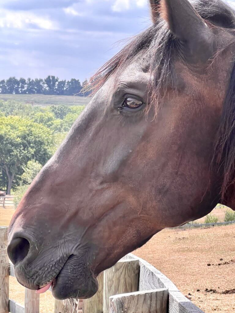 Today, I took a photo of an empty fence line where Dante and Dutch, now adopted, often stood flirting with the mares in the next field. For a moment, I felt sad — that familiar sting of loss. But in my relief — knowing they’d found a good home together — I turned around to face another paddock I’d visited numerous times before. And there was Stewie, a muscular draft cross who, until today, had always chosen to acknowledge me from a distance. Cautious, reserved, but suddenly braver than he’s been, Stewie moved toward the water trough where I was standing on the other side of the fence. After a long drink, he hung his giant head over the fence and softened his eyes, signaling that it was okay to connect. The goodbye I’d said to those two flirts — a good goodbye — had made room for another hello.