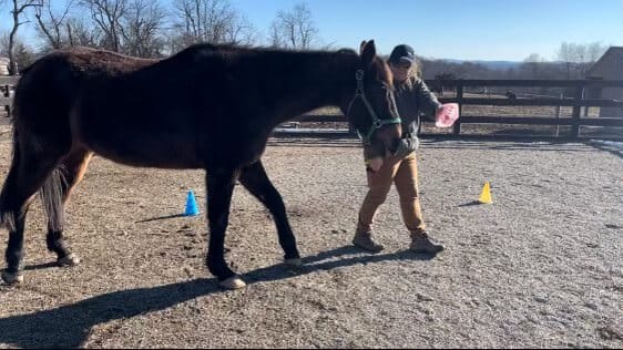 Our program uses clicker training because it is a force-free training method that centers the horse’s ability to consent and make choices. This is important: when we are working with older and unsound horses (or any other horse for that matter!), we want them to feel safe and confident saying no if something we ask them to do is uncomfortable for them. Also, the horses think clicker training is a great game!